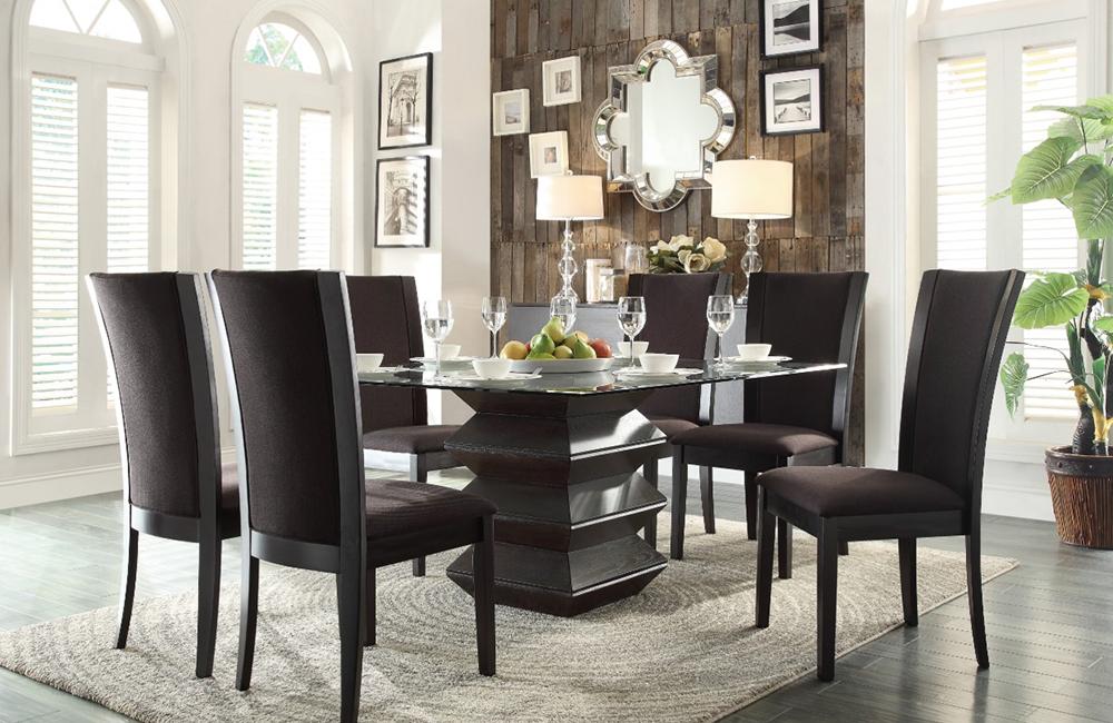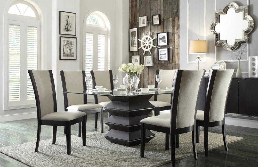 Sophisticated in its simplicity, the Monica Collection will be the center of attention in your dining room. Square beveled glass is placed atop an accordion shaped pedestal wood base. Finished in a rich dark espresso, the base prominently lends to the contemporary design. Each of the wood framed chairs features a flared design inset with either beige or dark brown fabric.