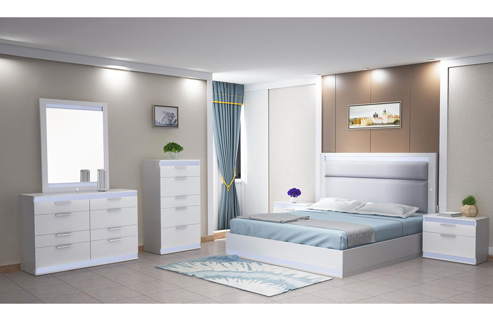 - Detail Description: Modern High Gloss White 4 pc. Queen Bedroom Set w/ LED Lighting