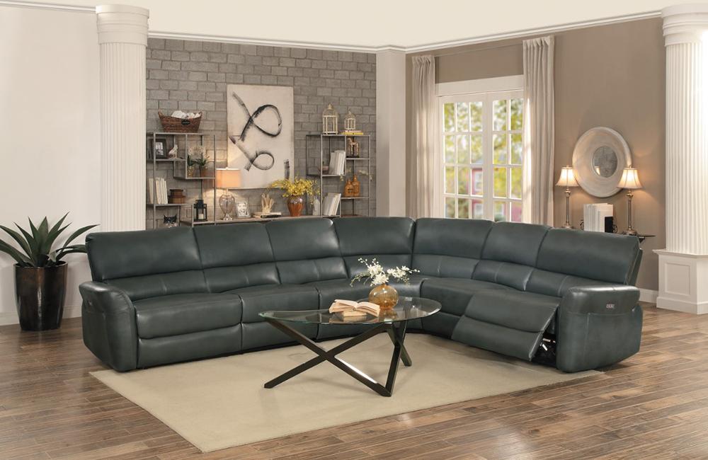 Soft modern styling paired with the ample size of the Naples Collection creates a dramatic look for your casual living room. Power reclining mechanisms extend the end recliners of the two one-arm-love-seats while power armless reclining chair and center corner provide additional seating within the defined space of the sectional. For additional styling complement, the seating group is covered in gray AireHyde match.