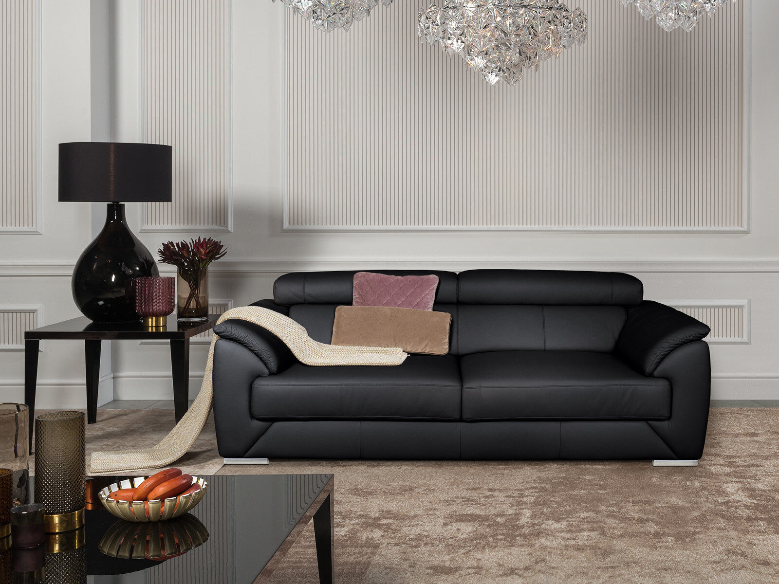 Expertly combining comfort and elegance, the Nicole three-seater sofa offers a luxurious seating experience. With options for leather or fabric upholstery in various colors, including gray, white, beige, brown, and black leather, as well as beige and green fabric, this sofa is versatile and stylish. The metal chrome legs provide a sleek and modern touch, while the manually adjustable headrests and high-quality foams, fabrics, and springs ensure optimal comfort. You can even upgrade to electrically extendable seats, powered by either mains electricity or batteries. Whether on its own or paired with other pieces from the Nicole collection, this sofa is a standout piece. Customization options are also available, including choice of upholstery material, color, and leg color, for a truly unique piece.