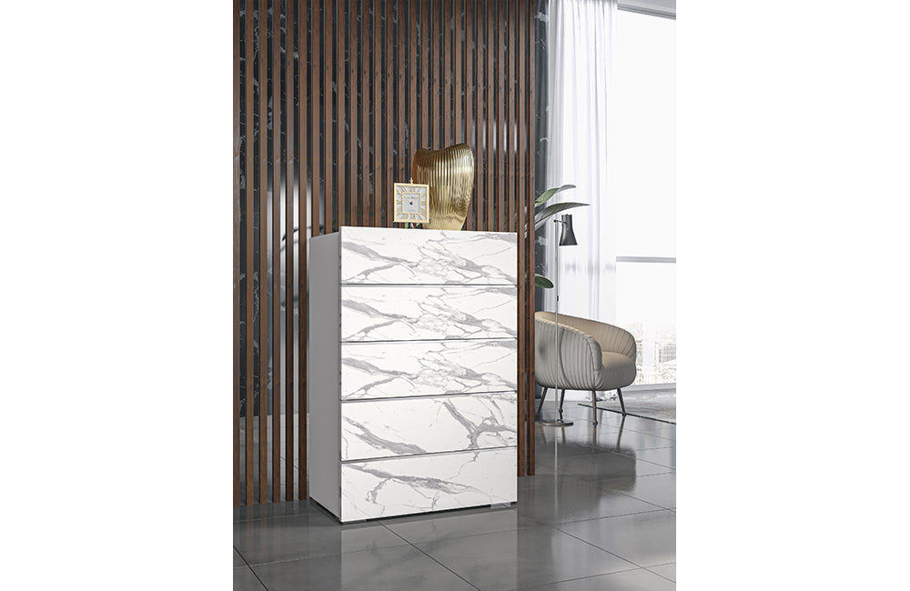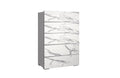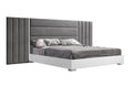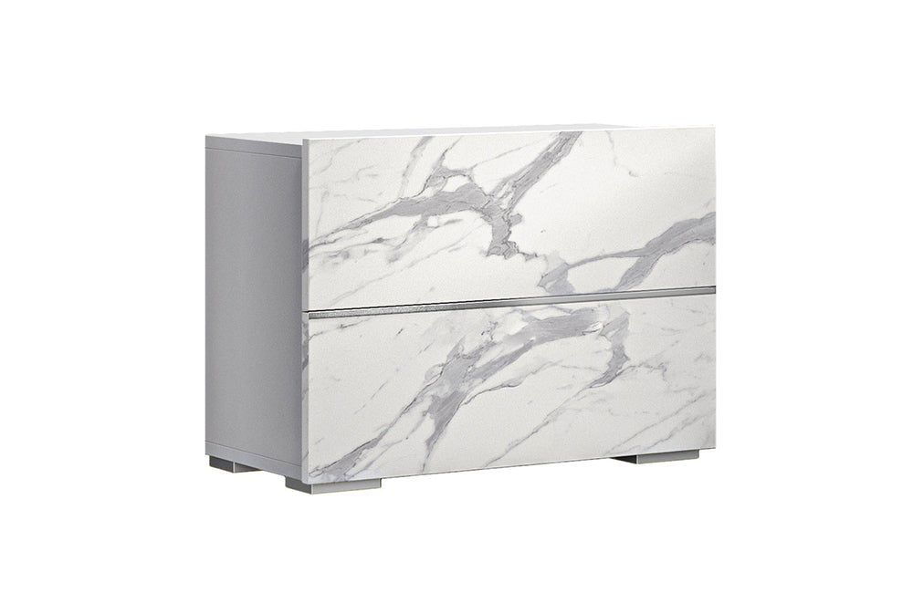 The Nina Bedroom collection by Paramus Furniture is our answer to the popular demand for lavish oversize headboards. The Nina Bedroom, made in Italy, is designed to prominently display the headboard; every detail complements and accentuates it perfectly. The headboard is upholstered in a grey velvet, partitioned by chrome accents. The body of the bed and accompanying case goods are finished in a white high gloss lacquer. All case good also prominently feature a white and grey marble look finish, further elevating this collection’s overall appeal.