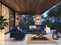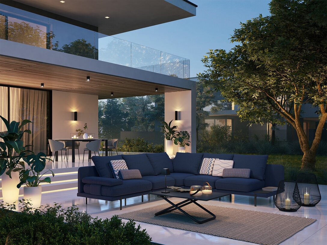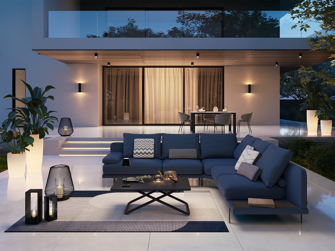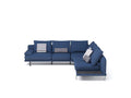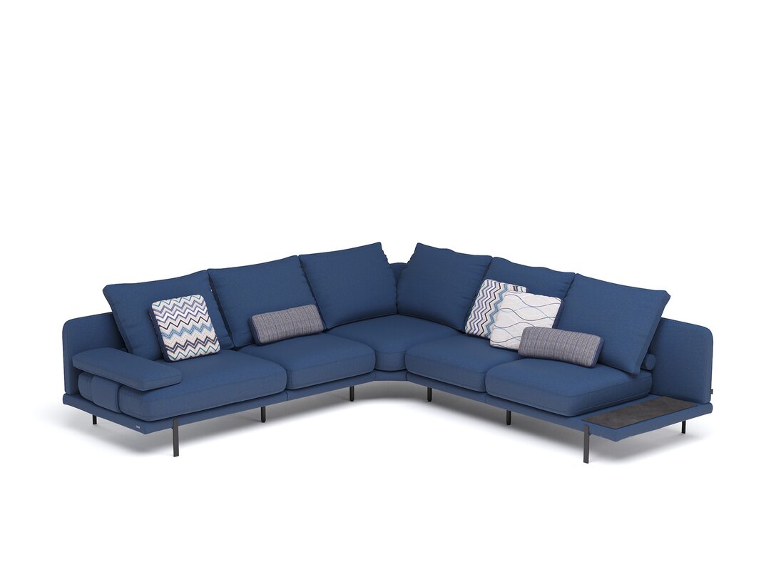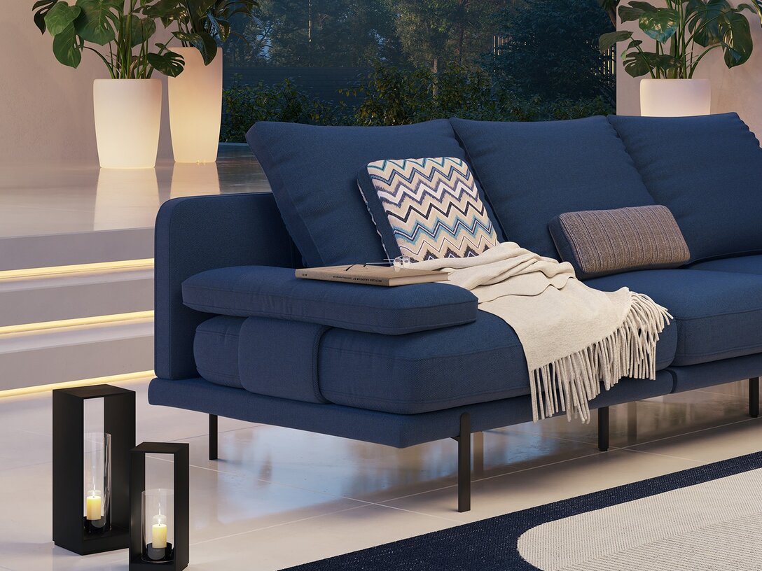 The Nordholtz Noa Sectional sofa offers the ultimate comfort with its luxurious and thoughtfully designed features. Made from high-quality fabric from the Sicily collection in gray, this modern corner sofa is perfect for any living room. The two parts of the sofa can be arranged on either the right or left side, with the only difference being the armrest style. The armrest is mounted on a "C"-shaped fiberglass connector and has a classic rectangular design. A unique touch is the bar on the opposite side, available in black or gray quartz sinter finish. The sofa stands on sleek black powder-coated metal legs, adding a modern touch to its appearance. The seats, backrests, and armrests are filled with soft nonwoven fabrics and high-quality foams and springs for optimal comfort. The back cushions are also adjustable and come equipped with an additional roller for proper positioning. Outdoor Fabric.
