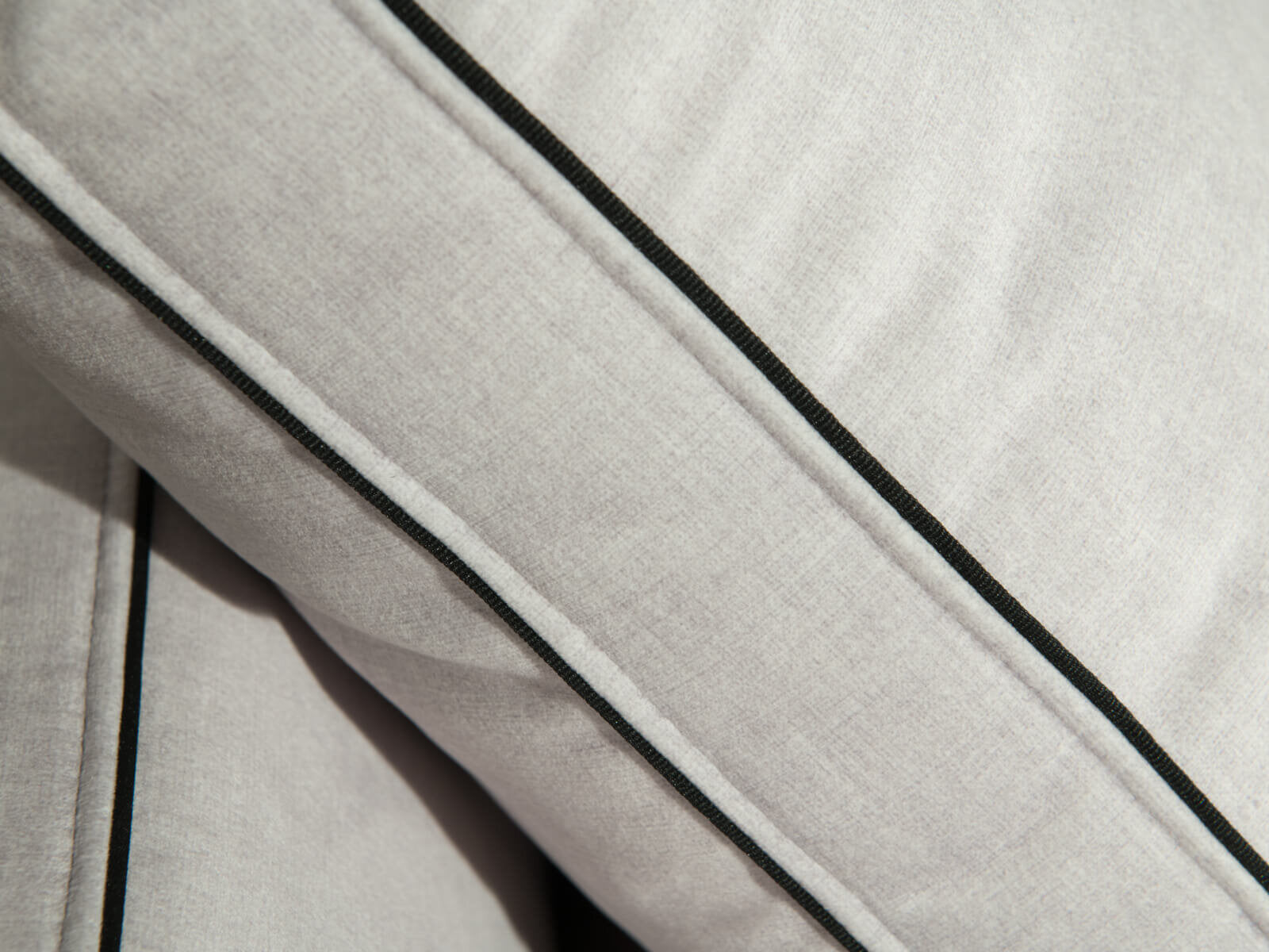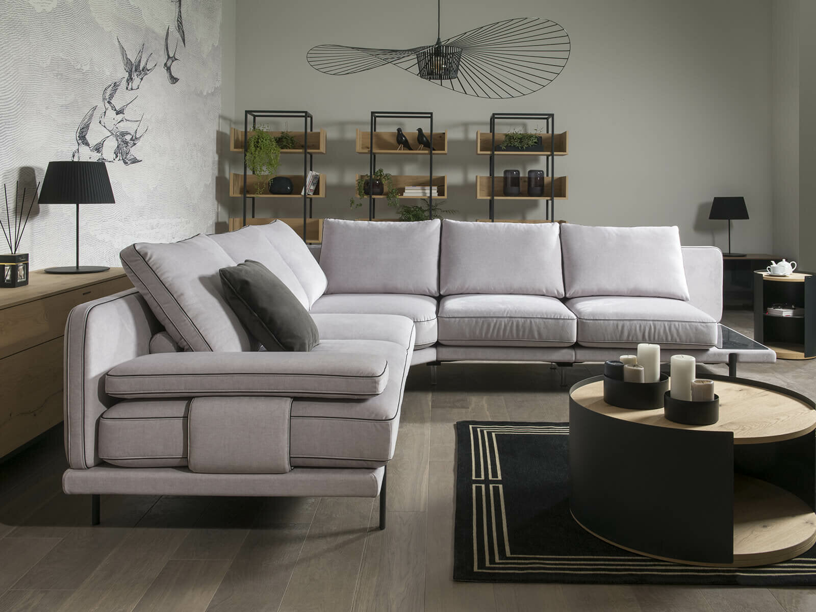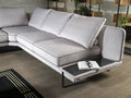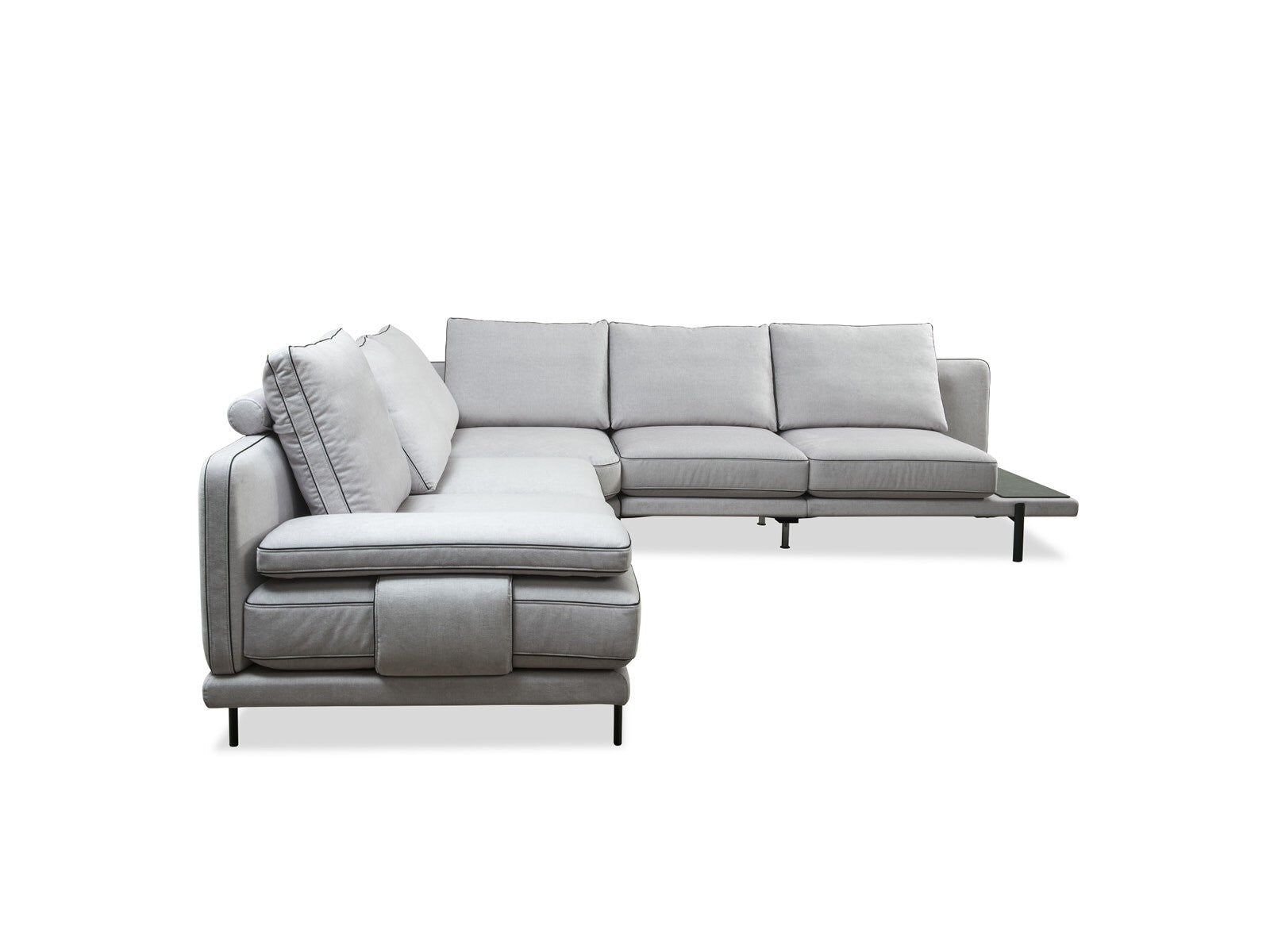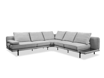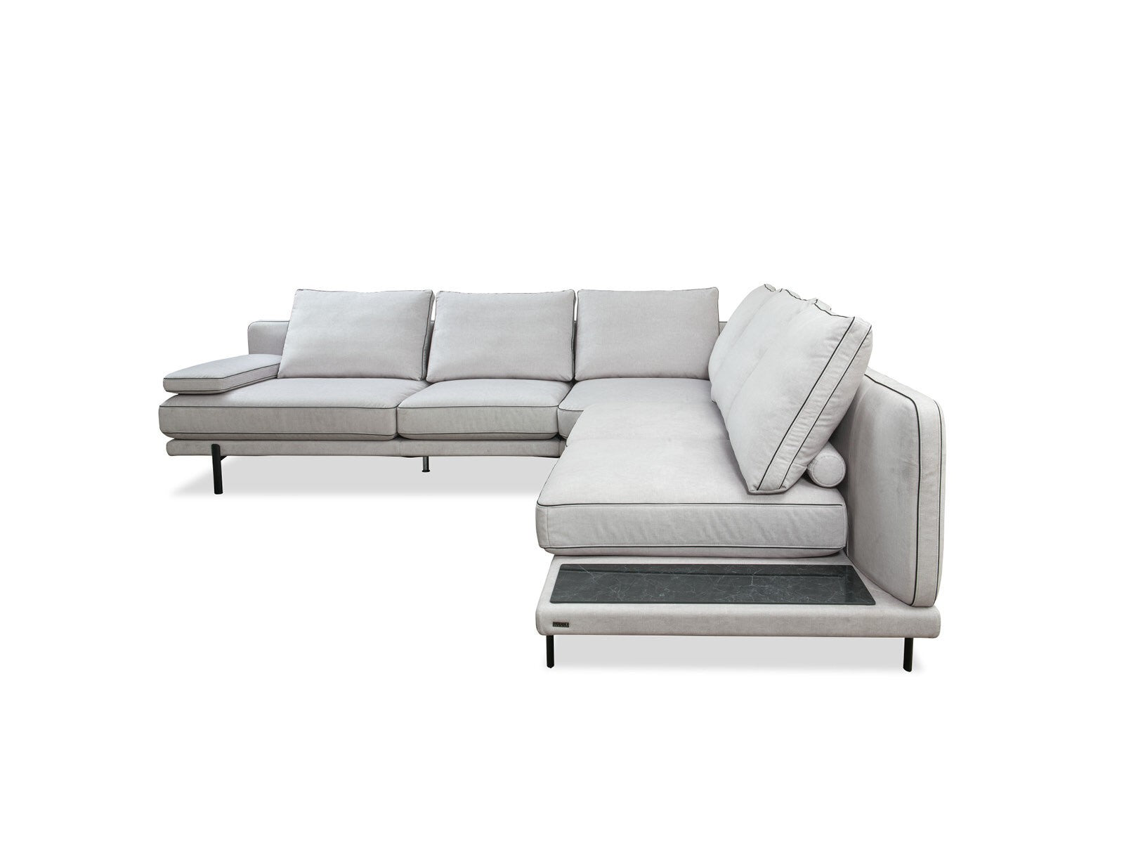 The Nordholtz Noa Sectional sofa offers the ultimate comfort with its luxurious and thoughtfully designed features. Made from high-quality fabric from the Sicily collection in gray, this modern corner sofa is perfect for any living room. The two parts of the sofa can be arranged on either the right or left side, with the only difference being the armrest style. The armrest is mounted on a "C"-shaped fiberglass connector and has a classic rectangular design. A unique touch is the bar on the opposite side, available in black or gray quartz sinter finish. The sofa stands on sleek black powder-coated metal legs, adding a modern touch to its appearance. The seats, backrests, and armrests are filled with soft nonwoven fabrics and high-quality foams and springs for optimal comfort. The back cushions are also adjustable and come equipped with an additional roller for proper positioning.
