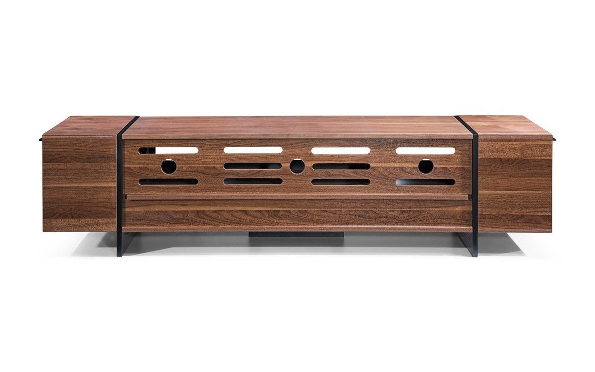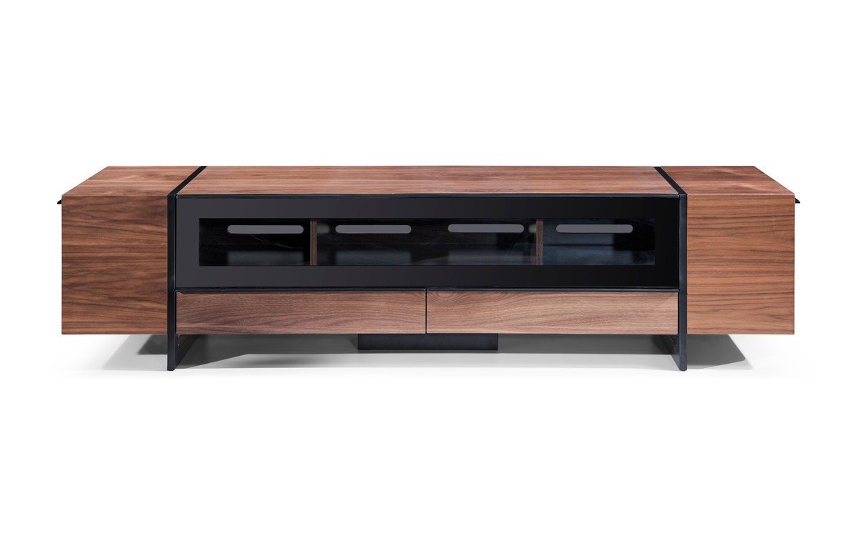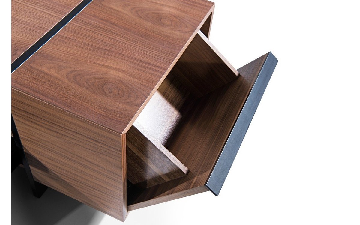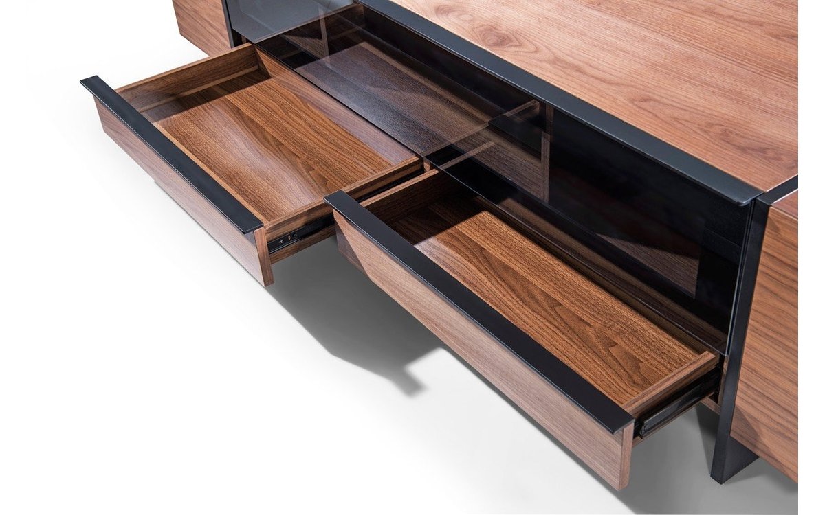 The Lorena TV unit is a state of the art entertainment center that was meticulously designed for space efficiency and organization. Finished in a walnut veneer material with stainless steel legs, the multi-storage unit includes 2 drop down hidden compartments on the sides, a glass remote control friendly pull down door with gas lift mechanism on its center, followed by 2 pull out drawers on the bottom. The back panel is placed with magnets so it can be easily detached for ease of access to cables and consoles with adjustable shelves and ventilation slots for electronics. The body is suspended by the sturdy stainless steel structure and it’s flushed to the top surface gives it a unique look and design.