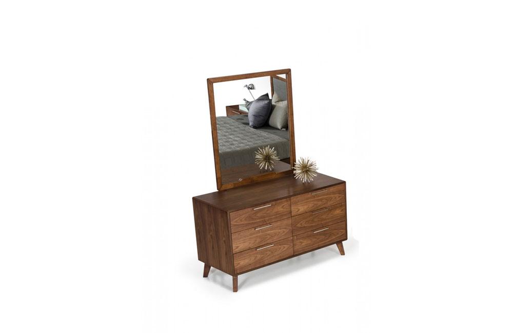 The Soria Modern Walnut Dresser offers a rustic feel featuring an alluring Walnut veneer finish mimicking a real wood surface. It features 6 roomy drawers with lustrous stainless steel handles. This modern dresser requires no assembly. The mirror can be ordered with the Dresser.Features