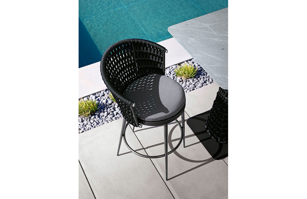 Outdoor bar stool with legs and structure in satined black metal. Back seat in