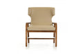 The Olenna Modern Taupe & Walnut Accent Chair is a picture of comfort featuring taupe leatherette upholstery and a Walnut finished ash wood frame. Further enhancing its coziness is the back -winged design. This modern accent chair requires no assembly.