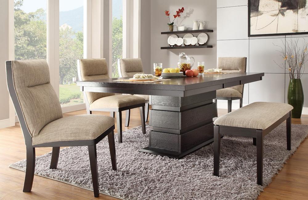 Your modern dining room will be perfectly complimented by the Oliver Collection. A dark espresso finish highlights the ash veneer providing a rich contrast to the clean contemporary lines of the tabletop and rectangular pedestal base. Neutral tone fabric chairs and bench feature wood framing and generously appointed seating.