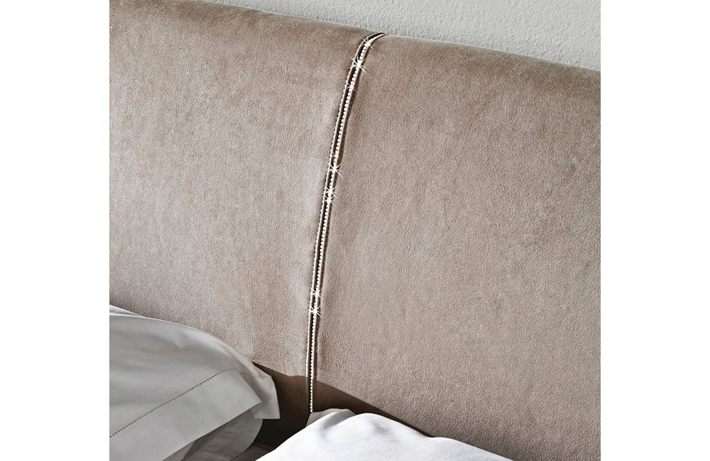 The headboard is upholstered in soft Nabuk eco-leather Made in Italy. Treated with stain repellent Teflon technology and finished with glitter effect. The original crystals strip from Swarovski of Austria are hand sawn onto the headboard by crafted Italian tailors.