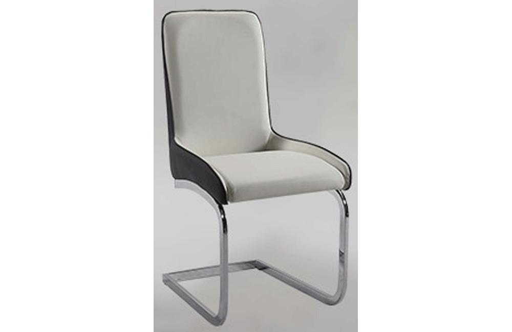 This scrumptious two tone brewer style side chair combines beauty and function with its gray and white faux leather upholstery and sturdy, metal chrome legs.