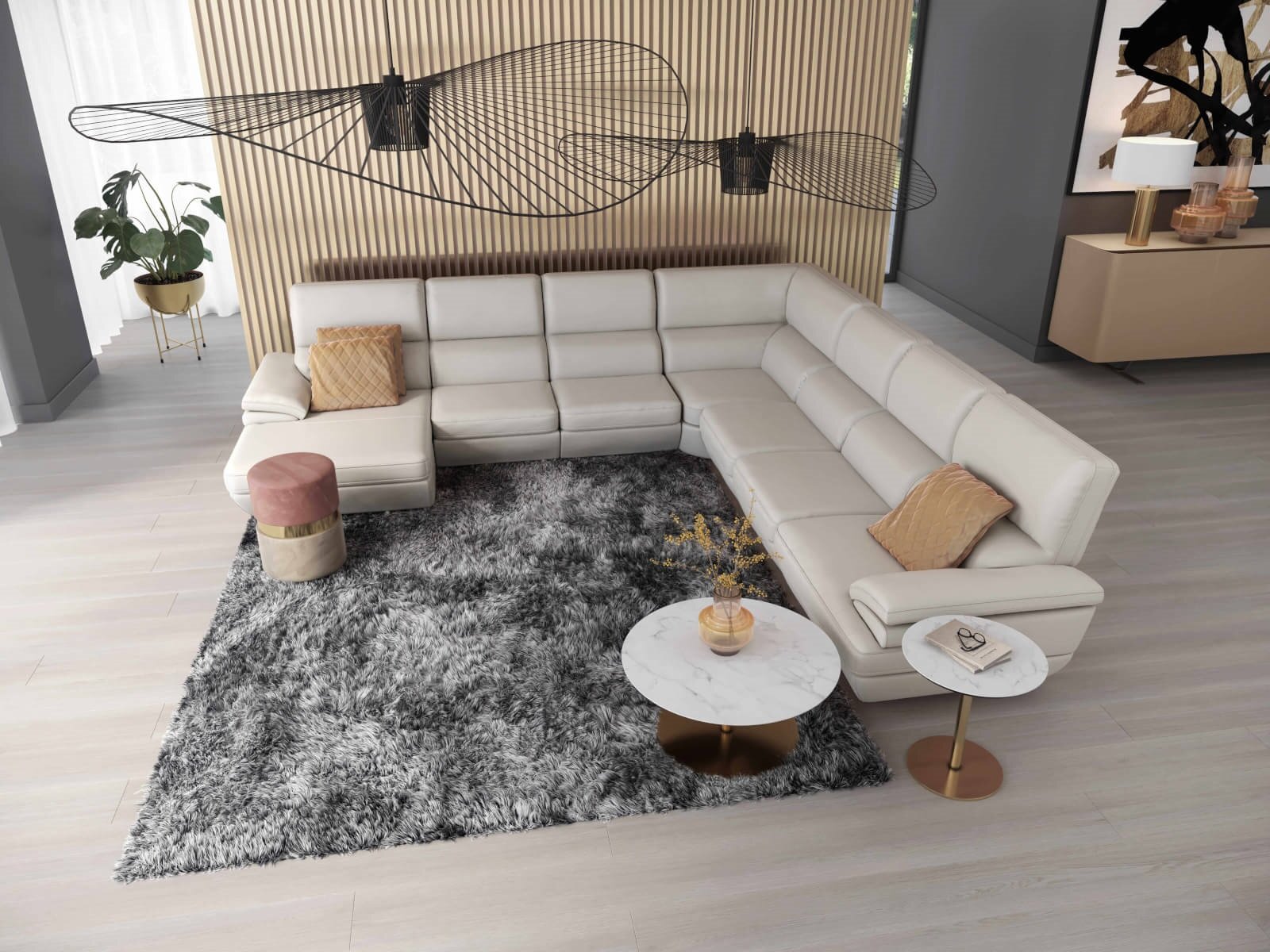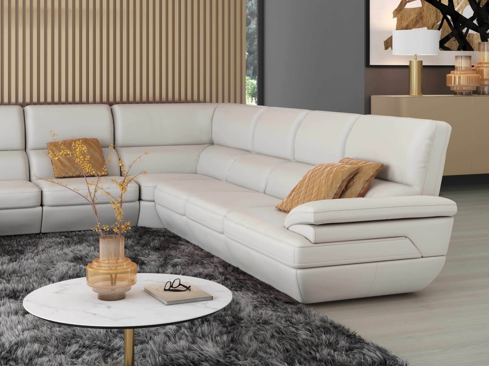 The Elva U-shape Left Chaise Beige Leather Sectional can be customized in various leather or fabric combinations and sizes. This luxurious corner sofa is a must-have for any sophisticated living room, offering both comfort and practicality. Its timeless style is available in both right or left-hand configurations, with upholstery options including white natural leather, orange fabric, or a combination of leather and yellow fabric. Not only does this piece stand out for its design, but also for its exceptional comfort provided by high-quality foams, non-woven fabrics, springs, and elastic belts used in the seats, backrests, and armrests. As a modular program, the Elva sectional sofa is made up of individual blocks to accommodate multiple people in ultimate comfort.