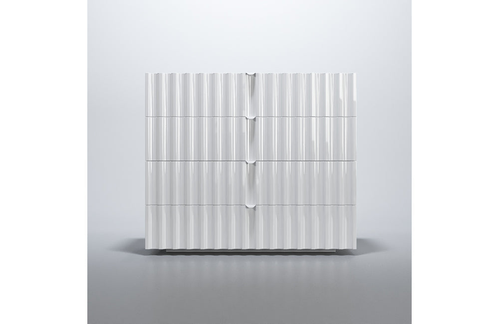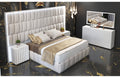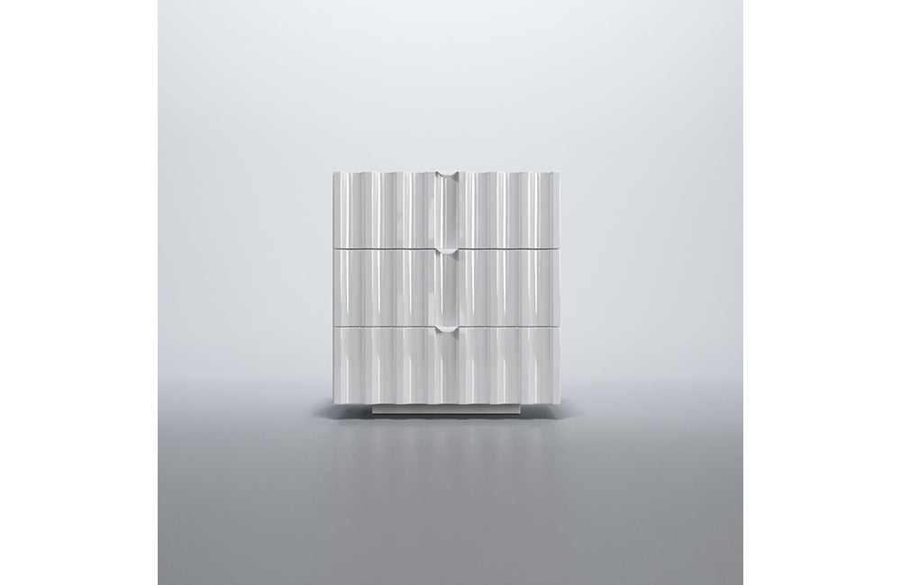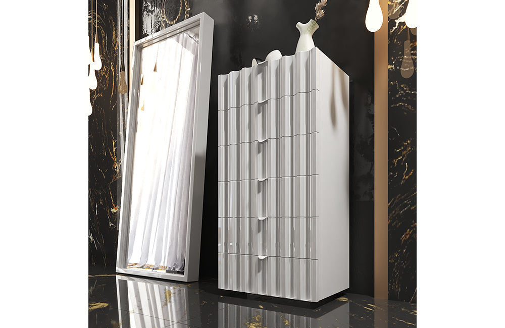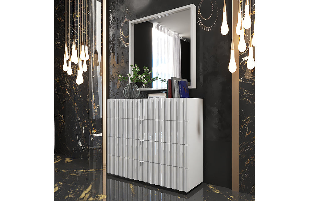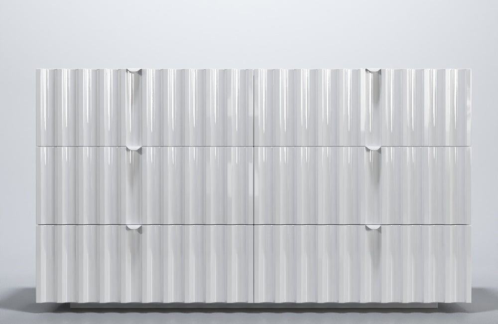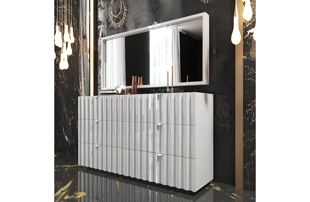 Orion is a new European collection of bedroom furniture. This bedroom set is made in modern futuristic style in white color. The incredibly beautiful pattern adorns not only the headboard of the eco-leather but also the surface of the remaining elements in a white glossy finish. The Orion bed is available in King Size and Queen sizes, you can also choose the storage option. The bed in any configuration always features LED light in its headboard.