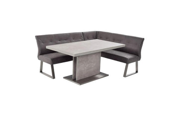 The Orsa 2 piece Dining Set is a modern complement to your dining room. The table features a laminated faux stone top and melamine veneers for a lightly distressed appeal. The corner nook, with microfiber upholstery and tufted accents, provides a beautiful finish. This set includes one self-storing butterfly leaf and seats up to six guests.