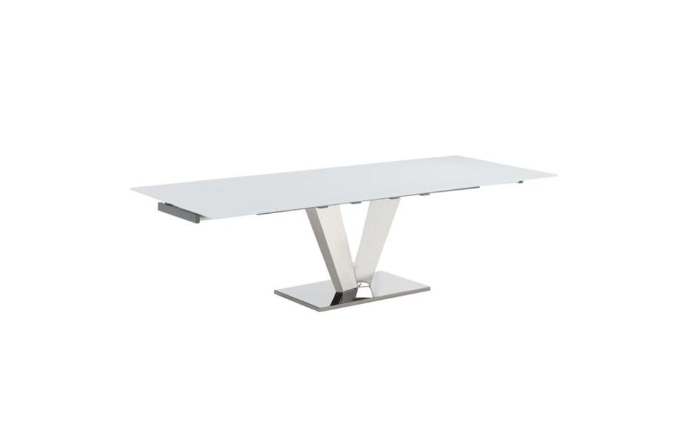 Otello Dining Table White Glass Top - 12mm Tempered glass sits atop a metal frame and stainless steel mirror finish legs and base. Legs form a “V” Shape towards the base and support an extension mechanism to accommodate to extra guests. Prepare for you dinner party with ease with the Otello dining table.