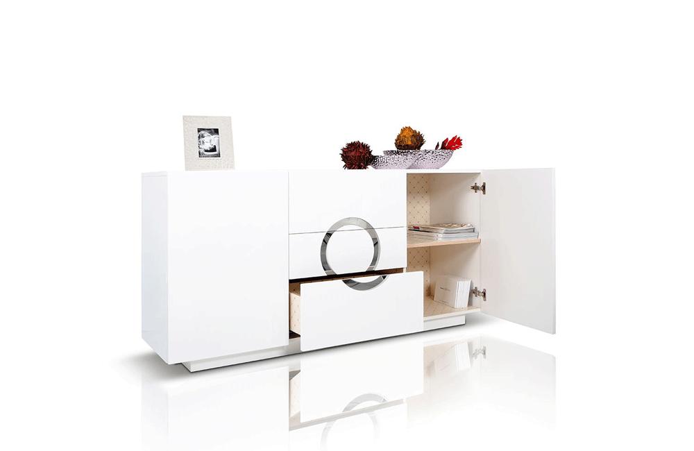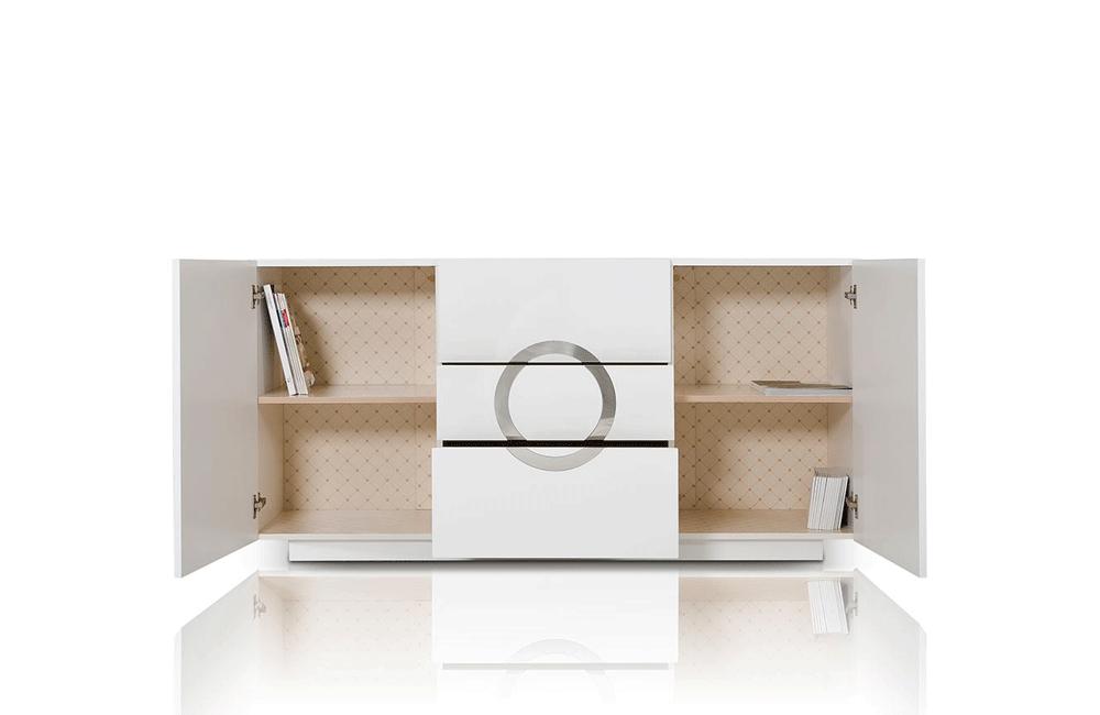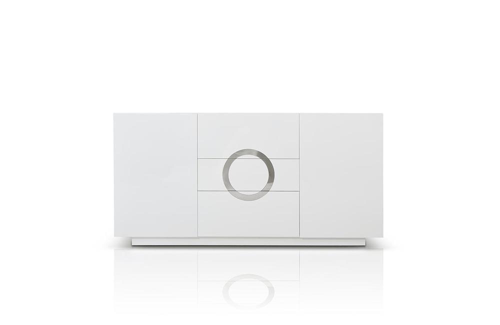 The frame of the Ovidius buffet is polished with a rich white lacquer to create a glistening effect. A stainless steel circular design adorns the front panels of the three drawer buffet. Self closing runners make the drawers open and close smoothly. Additional storage is provided by the shelving hidden by two side doors. Available also in black lacquer .