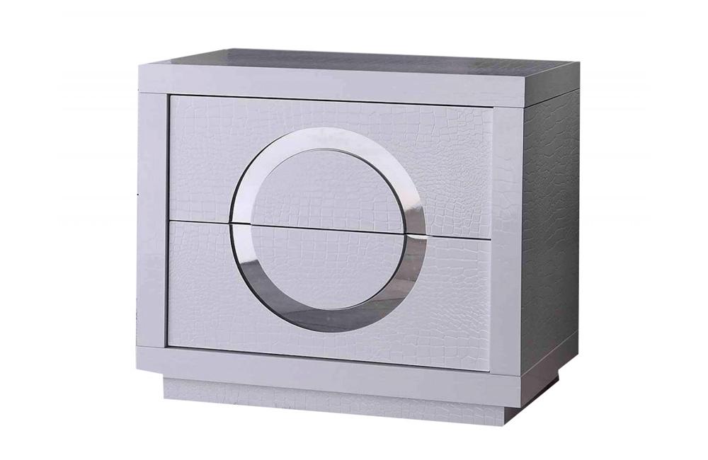 A detailed laser-cut crocodile textured pattern covers the framework of the Ovidius nightstand. The frame is then polished with a rich white lacquer to create a glistening effect. Stainless steel circular designs adorn the front panels of the two drawer nightstand. Also available in Black crocodile texture.
