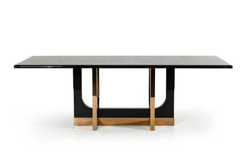 The Padua Modern Large Black Crocodile & Rose gold Dining Table features a lustrous rectangular black crocodile textured top that will give grace to any dining room. Laid on a stunning intersecting U-shaped black high gloss and Rose gold base, this modern dining table seat 6 comfortably.