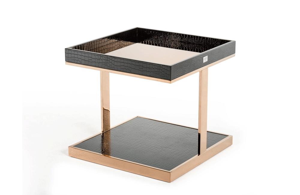 The Padua Modern Large Black & Rose gold End Table features a functional 2-level design featuring a recessed square black crocodile mirrored top and a base. Completing its posh design is the Rose gold top and frame with a dimension of W24" x D24" x H22". This fully-assembled end table is a sure scene-stealer in any living space.