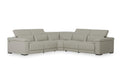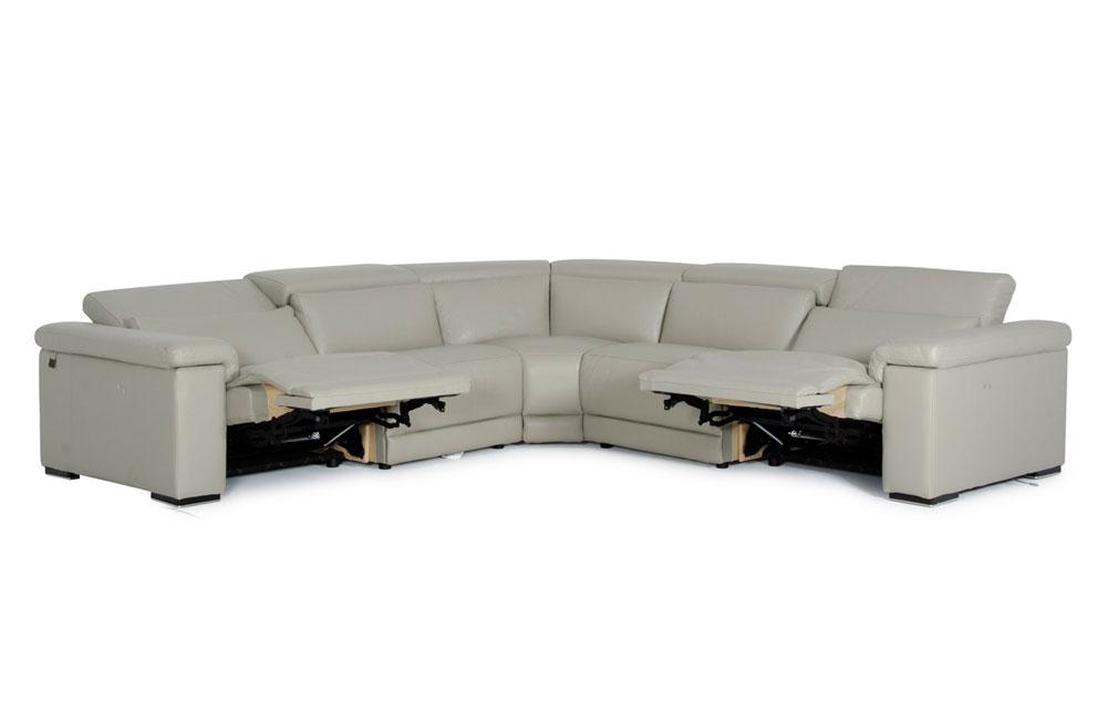 The Palinuro Modern Gray Leather Sectional Sofa features a smooth gray full genuine leather upholstery with spring-encased-in-foam seat cushions to prevent sagging. It features fold-down headrests for better head and neck support and left-facing and right-facing electronic recliners with armrests. Hand made in Italy, it stands on wood legs.
