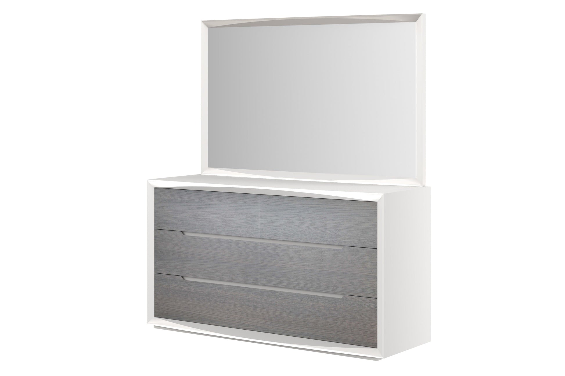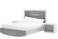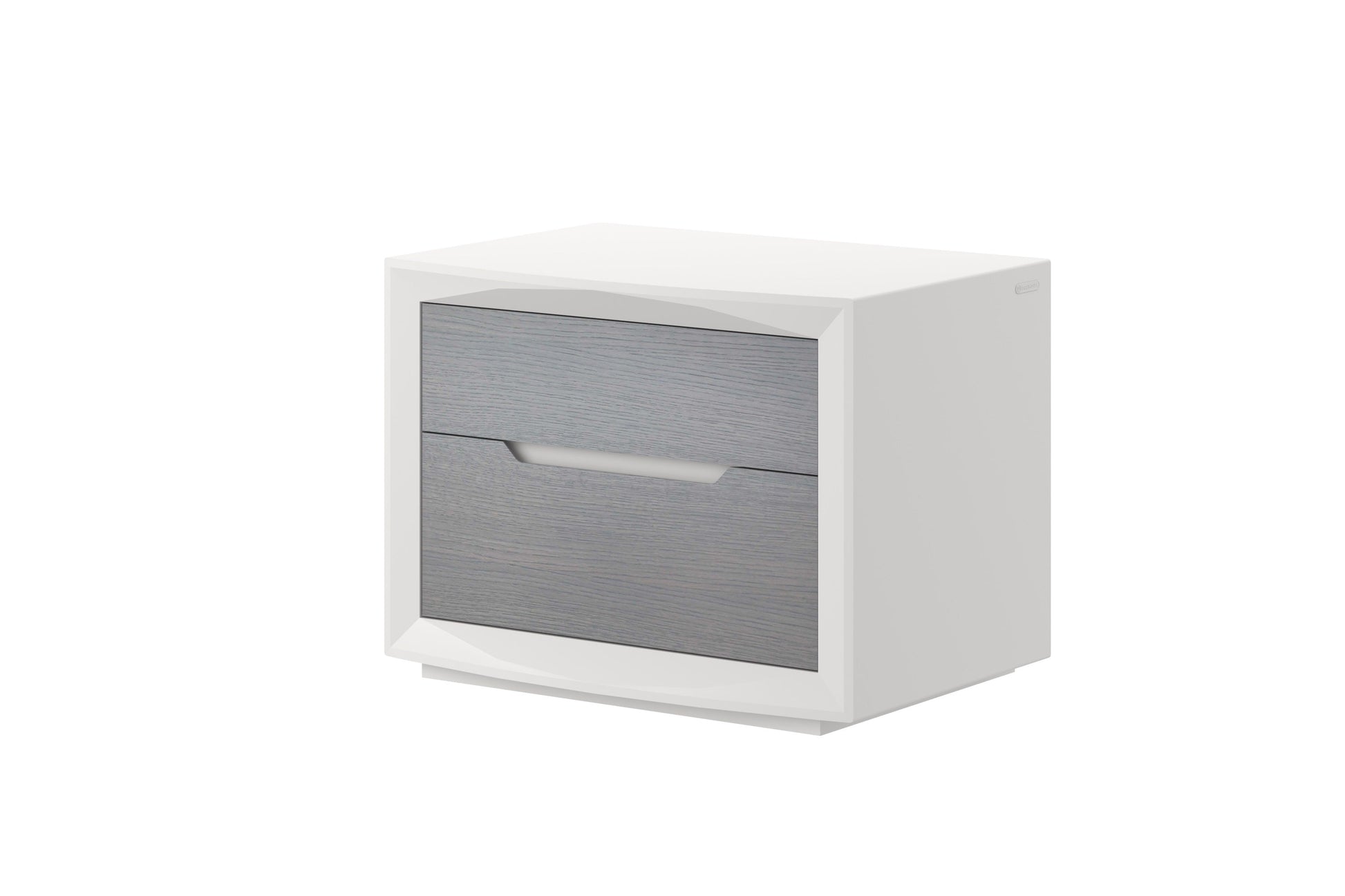 Paula premium bedroom features a minimalistic and classy design which looks gorgeous and compliment transitional or modern interiors. The bed comes in a grey wood veneer combined with light grey semi gloss finish and it has LED light. It is a platform bed, so no box spring required. The case goods are also in a light grey semi gloss finish combined grey wood veneer accents.