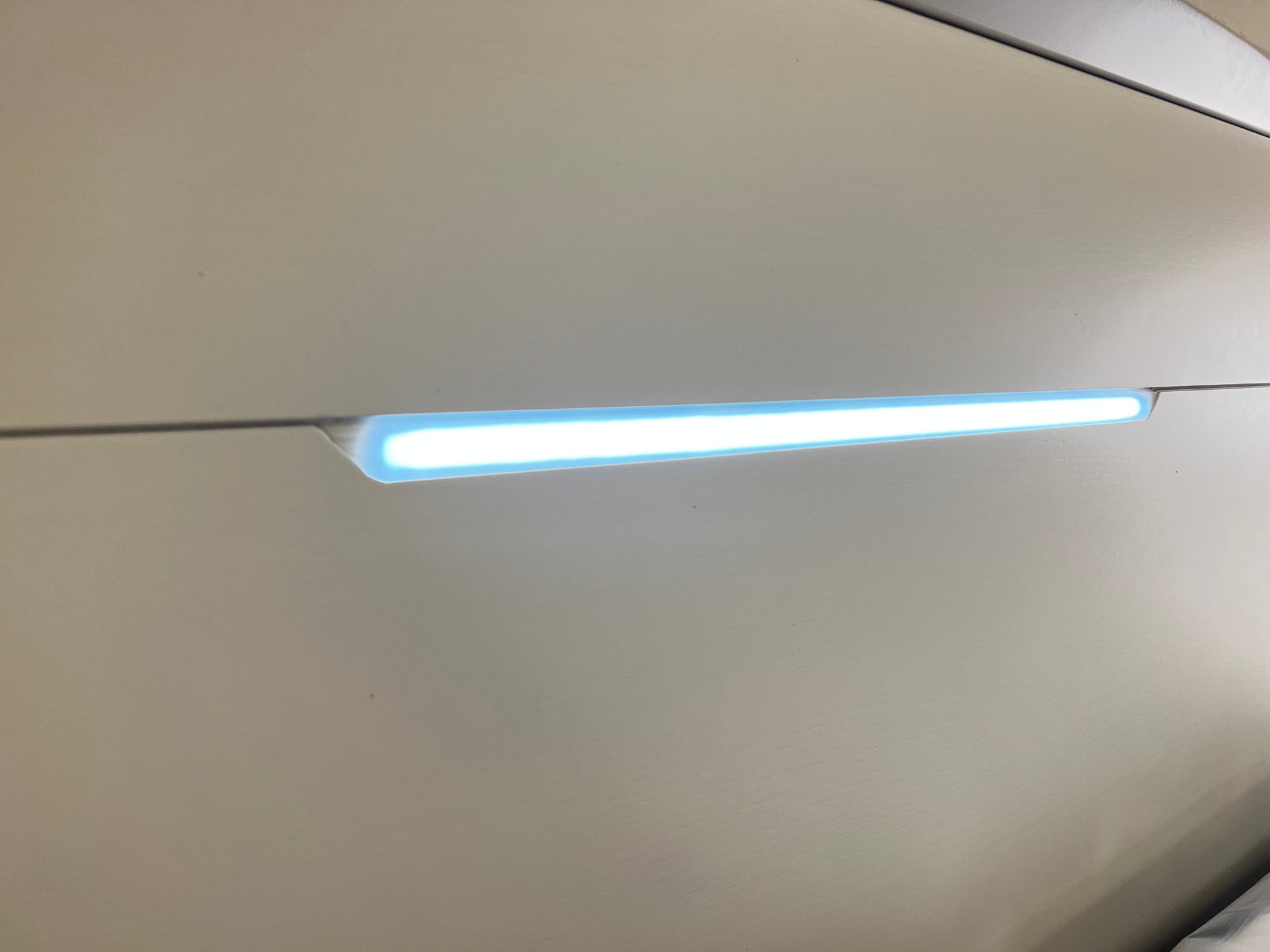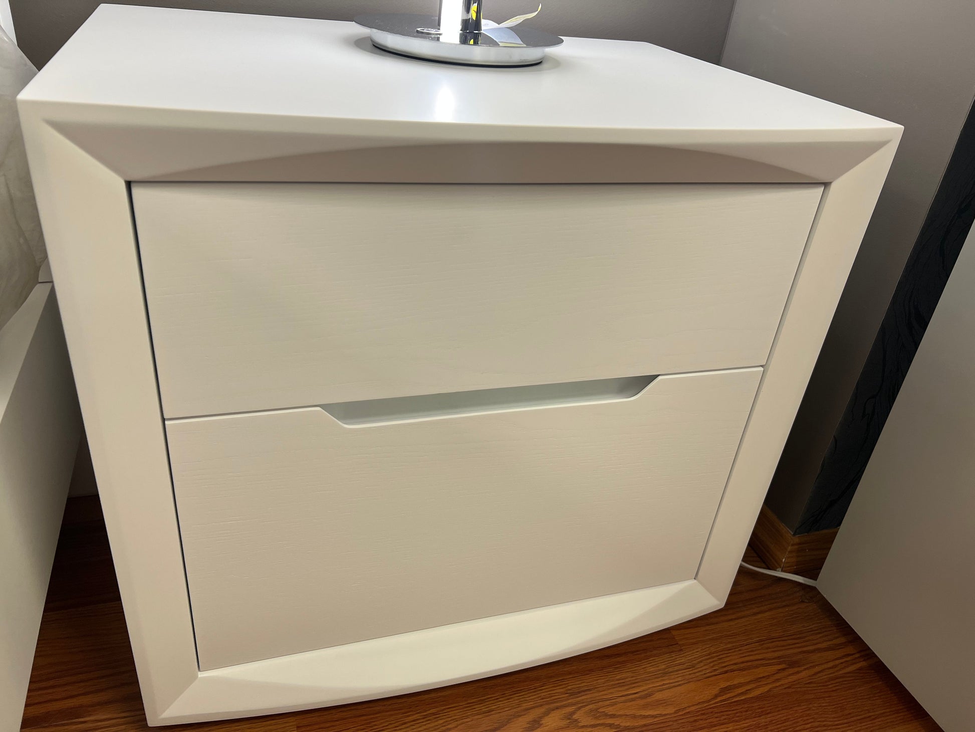 Paula premium bedroom features a minimalistic and classy design which looks gorgeous and compliment transitional or modern interiors. The bed comes in a white wood veneer combined with white semi gloss finish and it has LED light. It is a platform bed, so no box spring required. The case goods are also in a light grey semi gloss finish combined grey wood veneer accents.