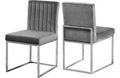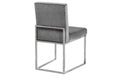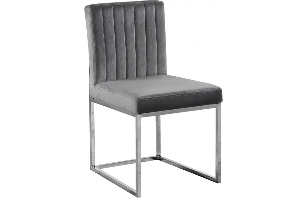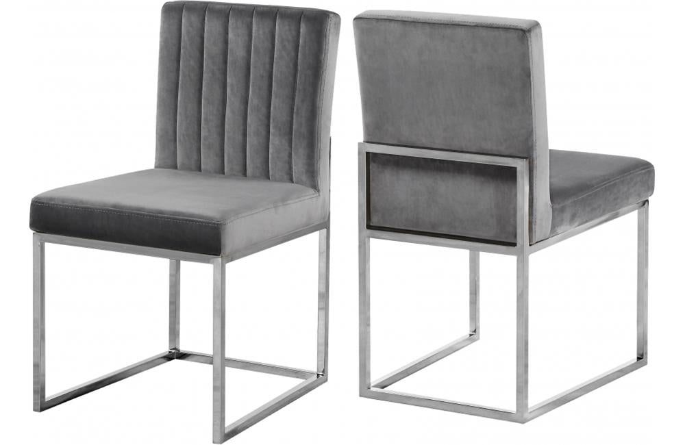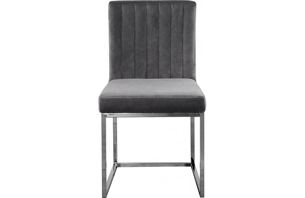 Take dining to a posh new level with this Pedro Grey Velvet Dining Chair. A boxy design makes it a nice addition to contemporary spaces, and it's armless design makes it easy to get into and out of with ease. The seat and back are upholstered in rich black velvet for a lavish vibe and a pop of sumptuous color to liven up your room, and both are padded well to make sure diners stay comfy while they enjoy their meal. The metal frame is finished in silver for added beauty and aesthetic appeal.