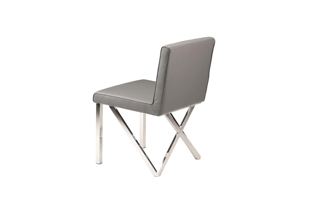 Percy dining chair's upholstered seat is essential to balancing its daring stainless-steel base. Two straight legs up front, and another 2 criss-crossed behind, are complemented by diagonal struts on either side. Available in blue, white, or Black naugahyde with a polished stainless base.