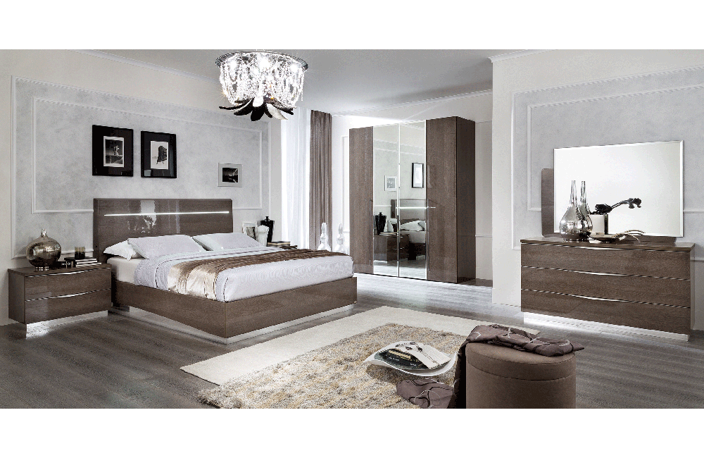 New Silver Birch finish to mark the unique, highly contemporary design of this bedroom PLATINUM. Modern lines combined with Art Deco’ details. Beveled mirror and wave shaped handles give a typical Made in Italy look to this bedroom. Wood diamond shaped headboard with LED light insert. Padded headboard “DROP” with vertical central Swarovski insert, side courtesy lights and lateral glass shelves. The bed ring has shaped side rails with chromed skirt and is made functional by an optional storage kit with lift mechanism.