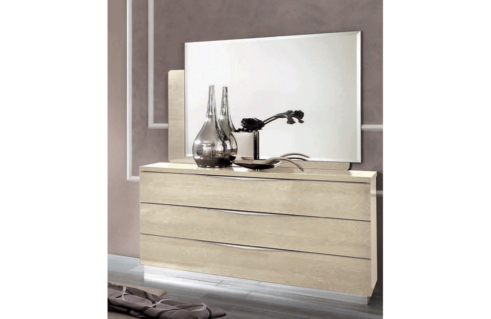 PLATINUM bedroom furniture set in Beige. Modern lines combined with Art Deco’ details. A beveled mirror and wave shaped handles give a typical Made in Italy look to this bedroom. Wood diamond shaped headboard with LED light insert. Optional storage kit with lift mechanism.