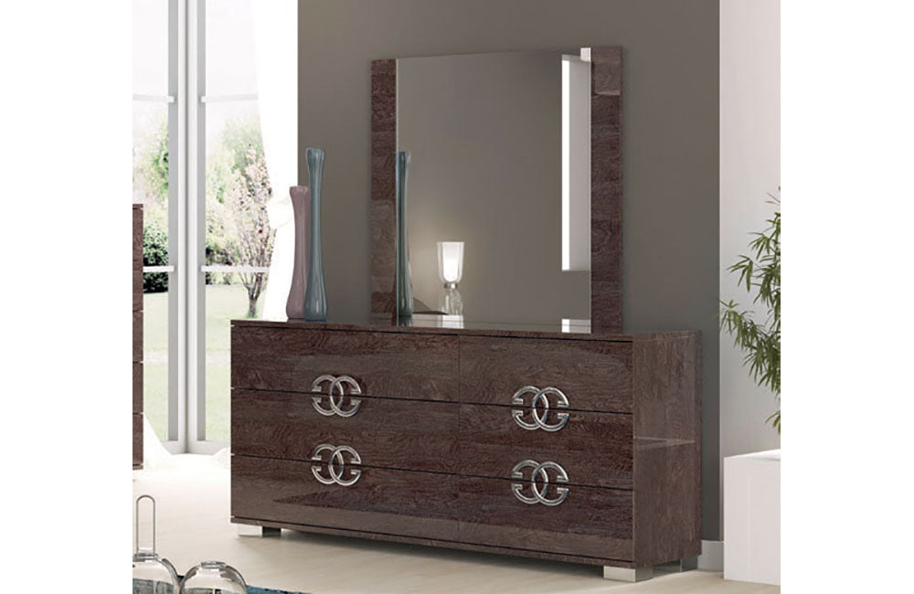 Georgia Bedroom completes the Day collection with essential items to furnish your home with exclusive style. Bed, elegant and sober, is also available with upholstered headboard for a more sophisticated taste. Chromed details enrich collection with a touch of impeccable charm and artistic distinctiveness. The Bedroom Set with Sleigh Bed consists of Queen Size Bed, Nightstand, Dresser and Mirror. The Bed is available in Queen and King Sizes. The 5-Drawer Chest is an optional items. Straight panels are in chipboard, then veneered (veneer being a thin layer of solid wood); then the veneers are lacquered using a 6 steps/layers of UV high gloss polyester lacquer. Manufactured according to European and international standards. Status Italy