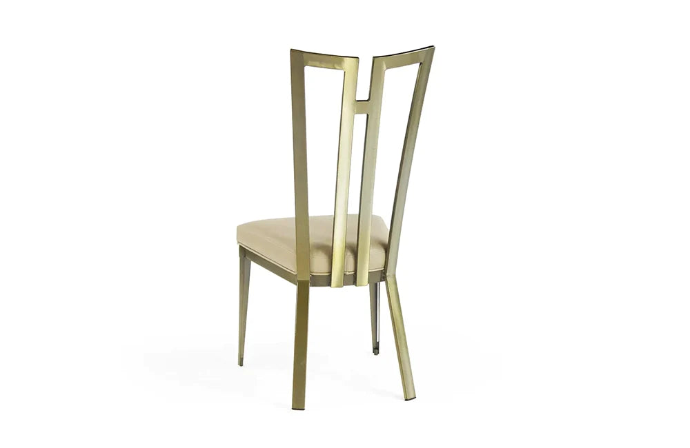 The Rayne Dining Chair is displayed in polished brass finish for a classic style that includes fine details. This dining chair weighs 25 pounds, with dimensions of 23.5 inches in depth, 18.5 inches in width, and 40.5 inches in height. The materials used to construct this beautiful chair include premium metal finishes, fabric, leather, and vinyl.