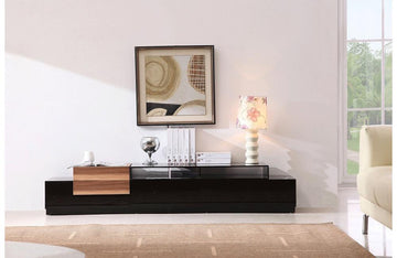 This Entertainment TV Center offers a contemporary look with a clean uncluttered design and functionally multipurpose structure. It features a large glass top with spacious compartments, as well as a low lying frame, crafted from durable wood, wood products and veneers. It is available in the Light Walnut mixed with Black High