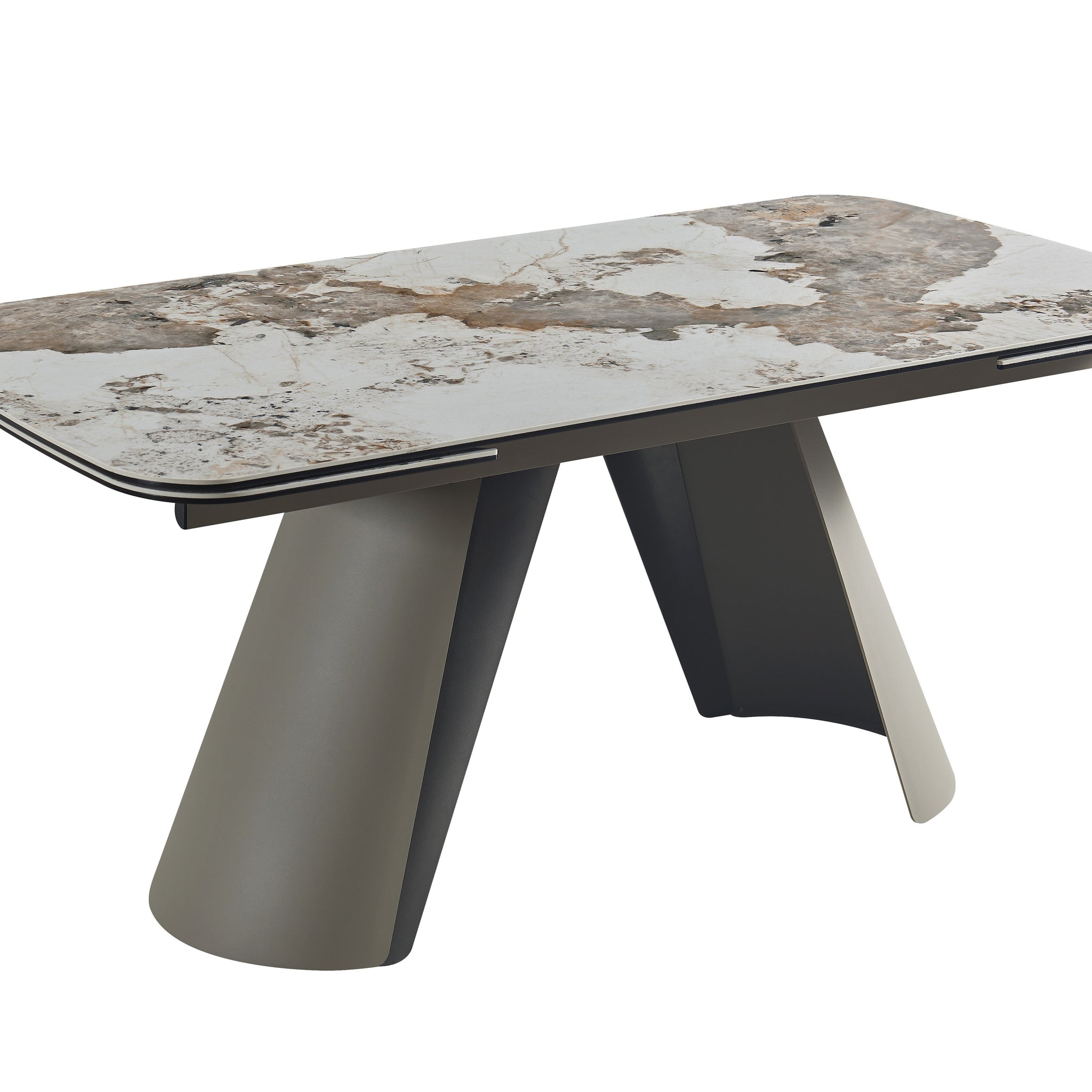 Introducing the Morandi Extension Table – a stunning fusion of modern design and functionality. This elegant dining table features a high gloss pandora ceramic top, known for its durability and sleek aesthetic, providing a sophisticated centerpiece for your dining area. For added versatility, the table includes extensions on both sides, allowing for a larger dining surface to accommodate more guests without compromising on style. The uniquely designed base features an outer shell in a light taupe finish, offering a soft, neutral tone that effortlessly complements a variety of interior styles. The inner shell, painted in a rich bronze, provides a warm, metallic contrast, adding depth and sophistication to the overall design. This table seamlessly blends form and function, making it the perfect addition to any modern home, whether you're hosting intimate dinners or grand celebrations.