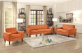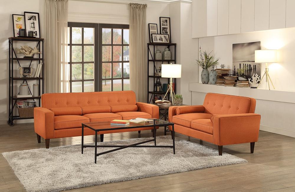 The classic lines of Mid-Century modern styling are perfectly executed in the design of the Rita Orange Collection. The profile of the straight back seating is defined by welting and button tufting. The collection is offered in either dark gray or orange fabric as a perfect complement to your decorative preferences. Further enhancing the retro-modern look are the toss bolster pillows and wood legs.