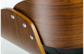 The Roblin modern black bar stool features a smart, chic design with a sleek brown wood seat upholstered in a smooth black leatherette. It is equipped with a pneumatic lever to easily adjust the seat height. Added convenience is provided by the round chrome plated footrest to this modern black bar stool that also swivels easily. Sturdy support is provided by the chrome plated base.
