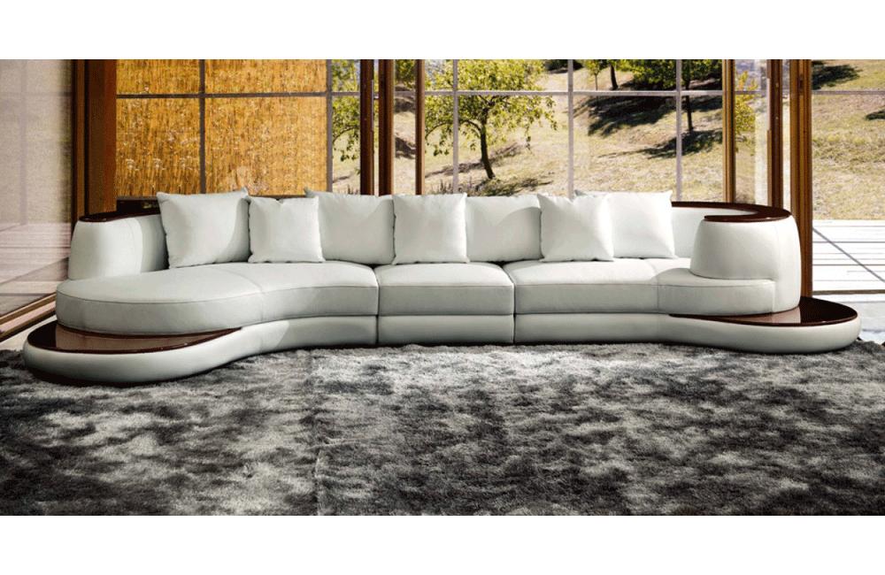 The Rodus modern sectional sofa offers superb texture and quality. Features glossy wooden panels as luxurious accents or storage of everyday things. It also has glossy end tables attached to the frame of the sofa to hold drinks. Upholstered in Italian leather where your body touches such as armrests, seat rests, backrests, headrests and leather match material upholstery elsewhere virtually indistinguishable to the Italian leather part. Available also rounded leather chaise.