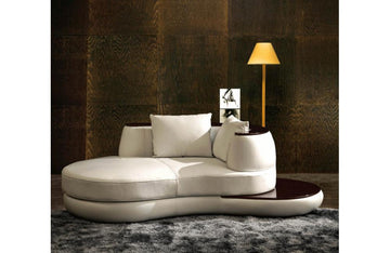 Rodus Rounded Leather Chaise with Wood Trim offers a comfortable and stylish seating suitable for small spaces with curved ends. Upholstered in snow white Italian leather/leather match, polished wood accents the top of the backrest. It features a burnished wood end table attached to its base.