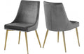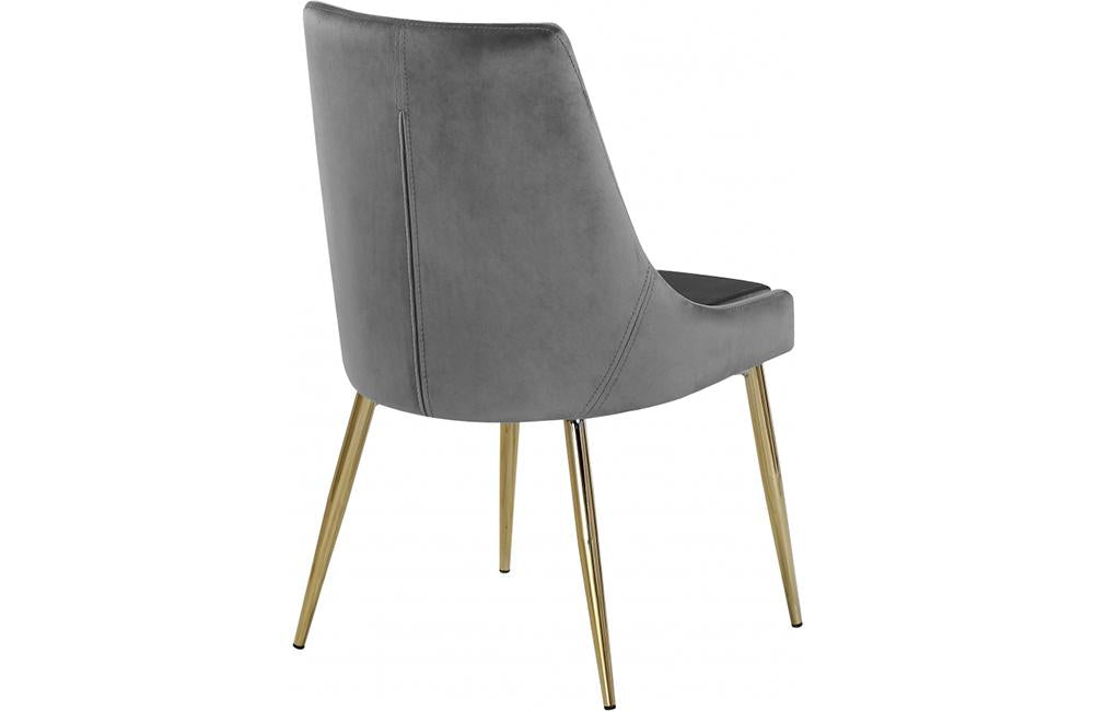 Extend contemporary panache to the dining room with this Rosario Grey Velvet Dining Chair. This dining chair features upholstery in sleek navy velvet for a modern look and has an armless design for a retro-inspired vibe. The stark navy color makes it easy to blend in with your existing decor colors or make a contrasting statement with ease. The slanted legs of this chair are gold finished for added modernity and to provide reliable and durable support while you dine.