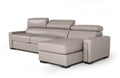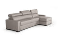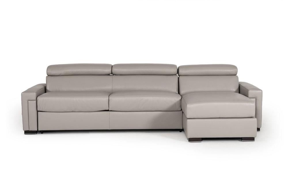 Bring style and versatility to the maximum is the intention of Sacha Modern Gray Leather Reversible Sofa Bed Sectional with Storage. This 3-seater modular sectional includes a chaise and a 2-seater sofa. The 2-seater converts into a bed easily letting you lie down or sleep anytime you want to. This feature is also great for use if you have guests, as well as for a teen's bedroom. The chaise is built with a lift-up storage compartment making bed linens, blankets, and pillows within easy reach. To enhance the comfort of this sectional sofa bed, it comes with adjustable headrests and long track arms. Black wood legs with stainless steel base provide steady support to this modern sofa bed sectional with storage. This sofa-bed is also available in Light Gray Leather.