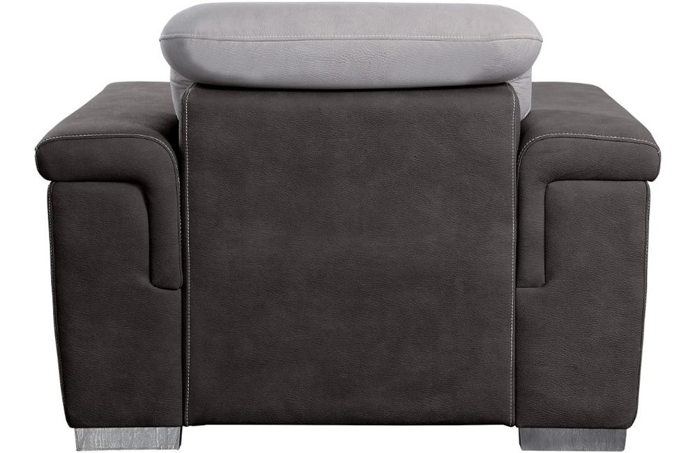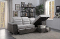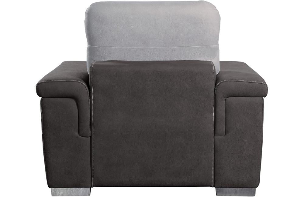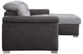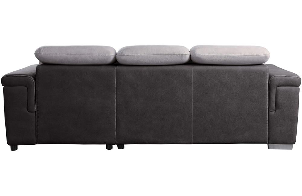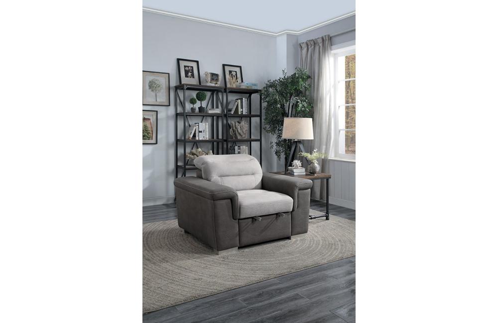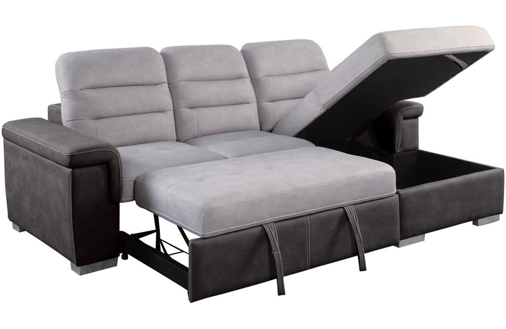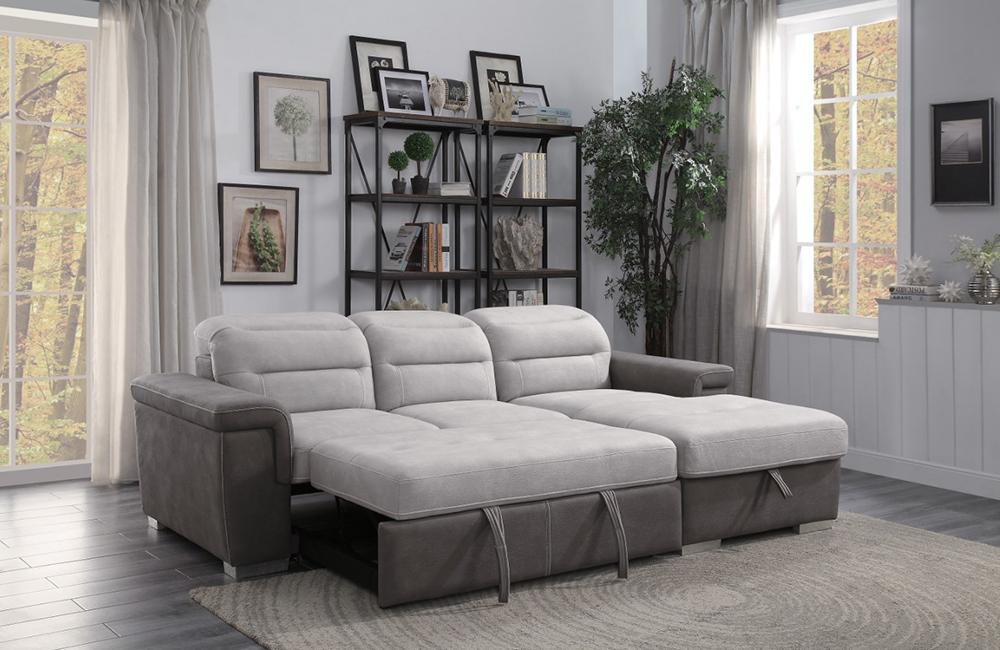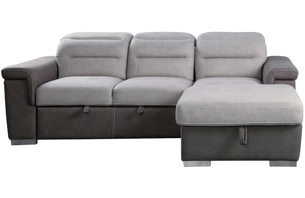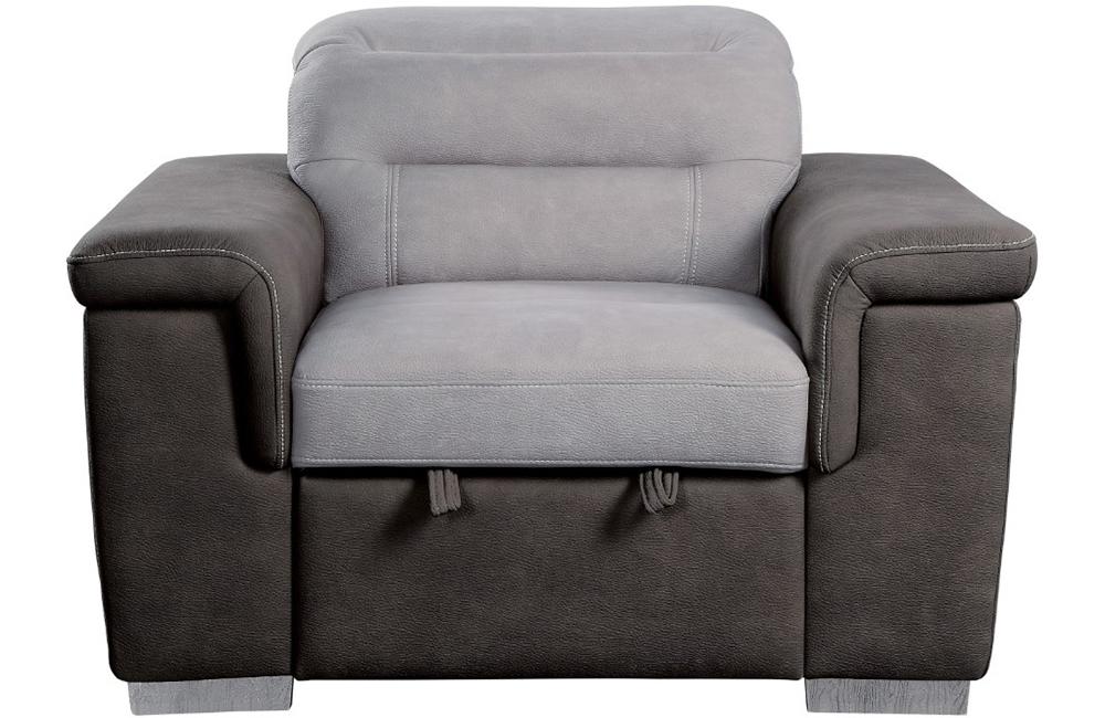 The contemporary look of the Sandy Collection is enhanced with extraordinary function creating storage and sleep space within your living room. Conveniently stored beneath the sofa is a pull out trundle that rises to create a bed while the top of the attached chaise opens to reveal ample storage space. The available coordinating chair features pull-out ottoman. The two-tone fabrics, adjustable headrests and the silver-colored feet further the modern look and functionality of this unique seating collection.