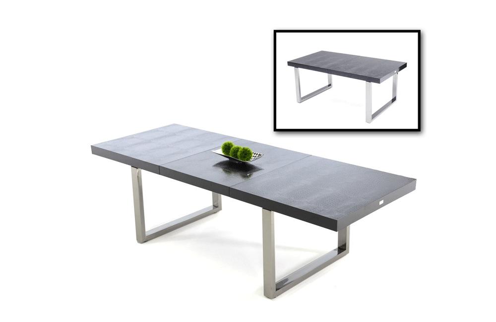 The Skyline extendable dining table features a laser-cut crocodile textured finish in black gloss lacquer. Square stainless steel legs complement the sleek lacquer finish. Available also in white with the option of crocodile texture.