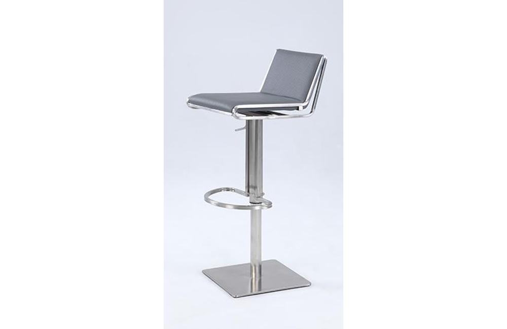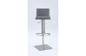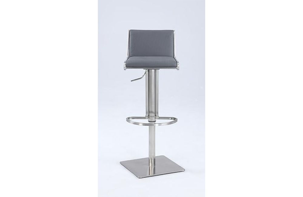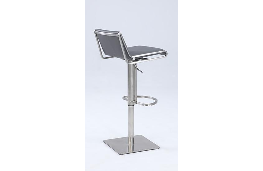 Modern gas lift adjustable height stool , Seat height adjusts easily , Cushion upholstered in durable gray PU , Slanted and contemporary back rest, Footrest for extra comfort , CA fire retardant foam .