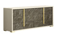The Sonia Bedroom collection by Paramus Furniture is a great new addition to our modern bedroom category. The Sonia Bedroom blends a sophisticated pearl high gloss lacquer finish with gold accents. The headboard and case goods feature a fractured brown & cream marble look, and the LED light on the bed further highlights this finish. The Sonia Bedroom is made in Italy using the finest quality materials and construction.