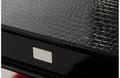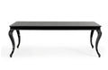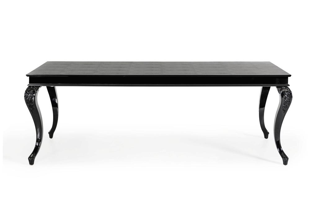 Black curvy legs with a gloss finish accent the large rectangular dining table. The Sovereign dining table features the signature laser-cut crocodile texture on the table top with a rich black lacquer finish.The table can be ordered also with the Sovereign chairs - Showcasing an artistic design, the transitional Sovereign fabric chair features an elegantly curved high back upholstered in black velour fabric. Black curvy legs with a gloss finish complement the curved back design.