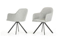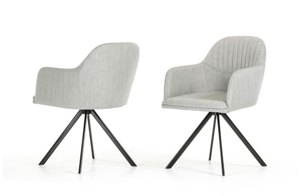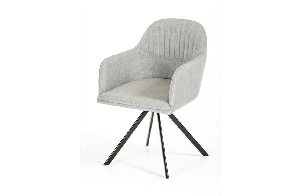 The Synergy Dining Chair is inspired by Mid-Century designs and features four metal legs coated in a black matte lacquer that splay out in a triangular form from the base. The chair swivels on the tip of the base to create comfort and ease of use. Upholstered in a bright blue fabric for a fun pop of color, the Synergy also features a patterned top made by decorative stitching and slight tufts. Available also in blue fabric.