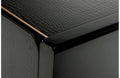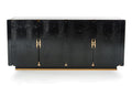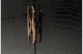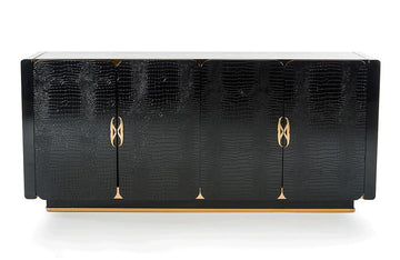 Talin Modern Black Crocodile & Rose gold Buffet features a classy black crocodile textured top and door fronts with lustrous black high gloss sides. It features two 2-door cabinets, each with 2 inside shelves offering you adequate storage. The doors feature curved edges and Rose gold handles. Rose gold accents highlight the edges of the buffet top, lower ends of cabinet doors, and base.