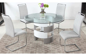 The tempered clear glass top of this table joins with the artistic stylings of the gray and white pedestal open cylinder base to create a truly stunning example of contemporary furniture. A lovely gray faux leather upholstered side chair, upheld by a sturdy cantilever frame.