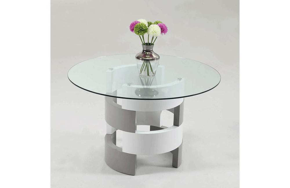 The tempered clear glass top of this table joins with the artistic stylings of the gray and white pedestal open cylinder base to create a truly stunning example of contemporary furniture.