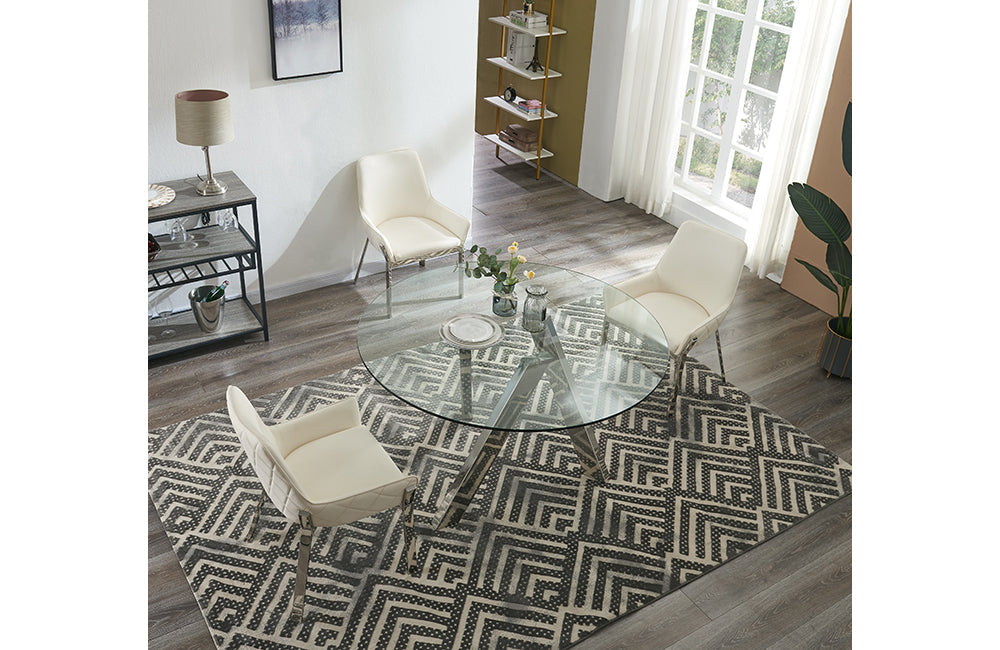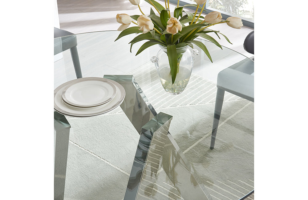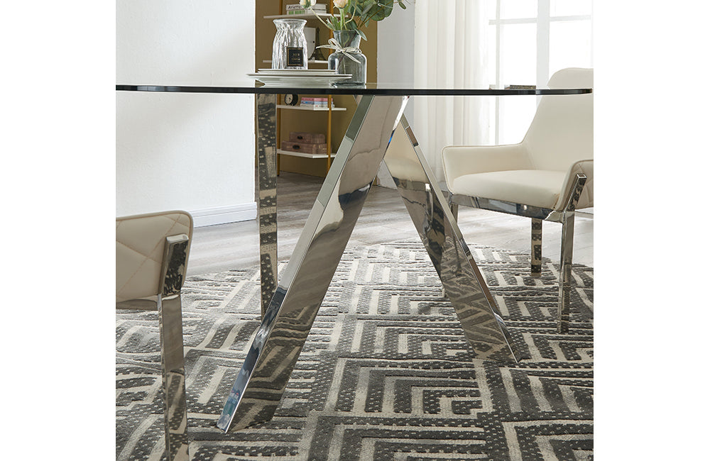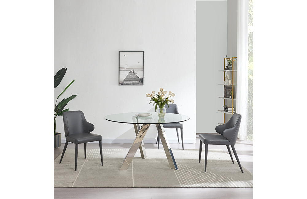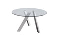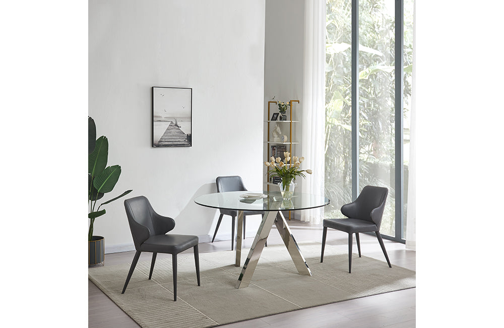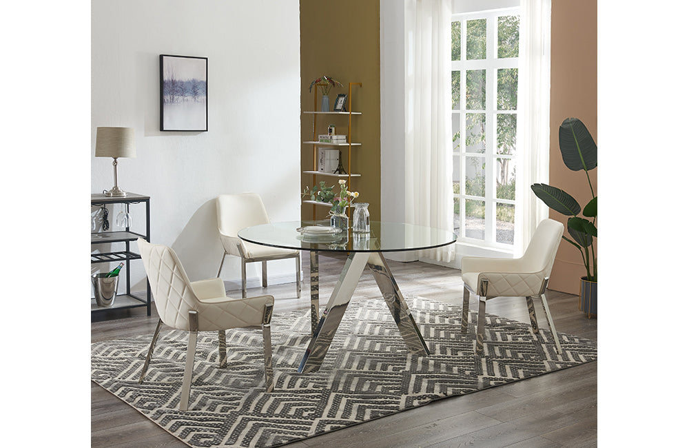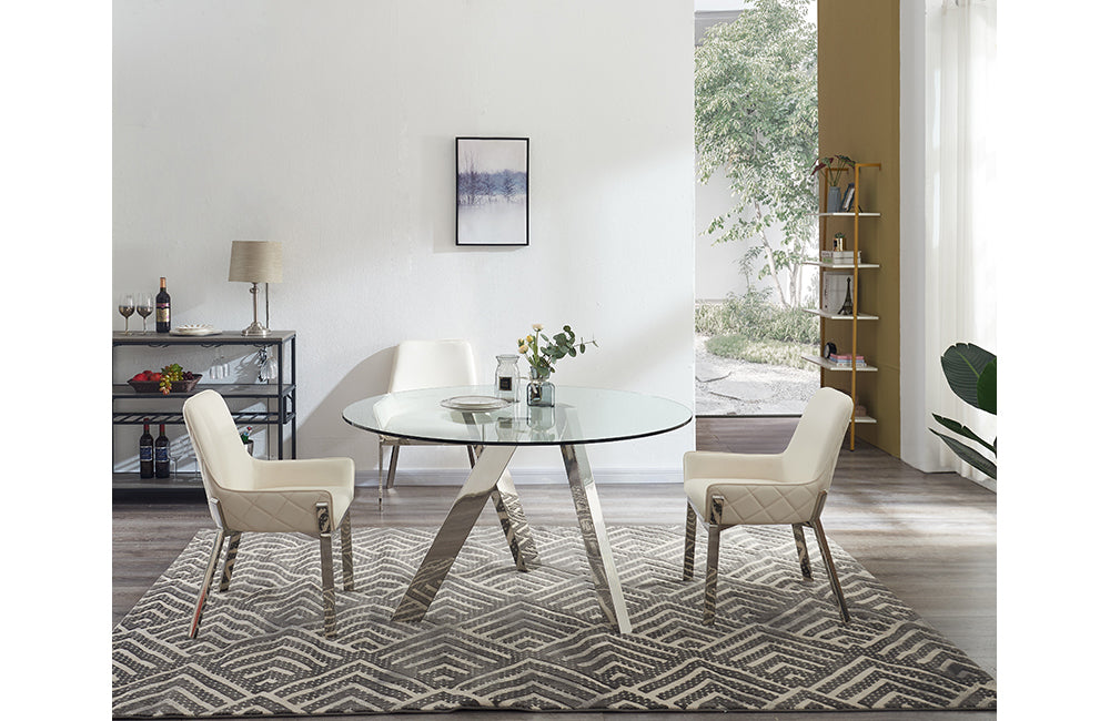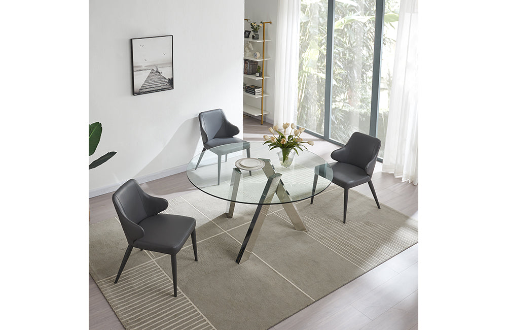 The Tower Dining Table by Paramus Furniture is the perfect addition to any home breakfast nook or eat in kitchen. The clear tempered glass table top is accented by the modern polished steel base. The sleek profile is a perfect fit for any home looking to maintain a minimalist aesthetic.