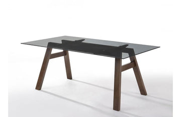 Out to smarten up your dining room is the Travis Modern Gray Glass and Walnut Dining Table. Featuring a rectangular tempered grey glass top, it stands on thick Walnut finish solid Rubber wood legs sprawled in a slanted position. The glass top is screwed securely on horizontal bars placed across the solid legs. Sitting 6 persons comfortably, this modern dining table is perfect for both casual and formal dinners and gatherings.